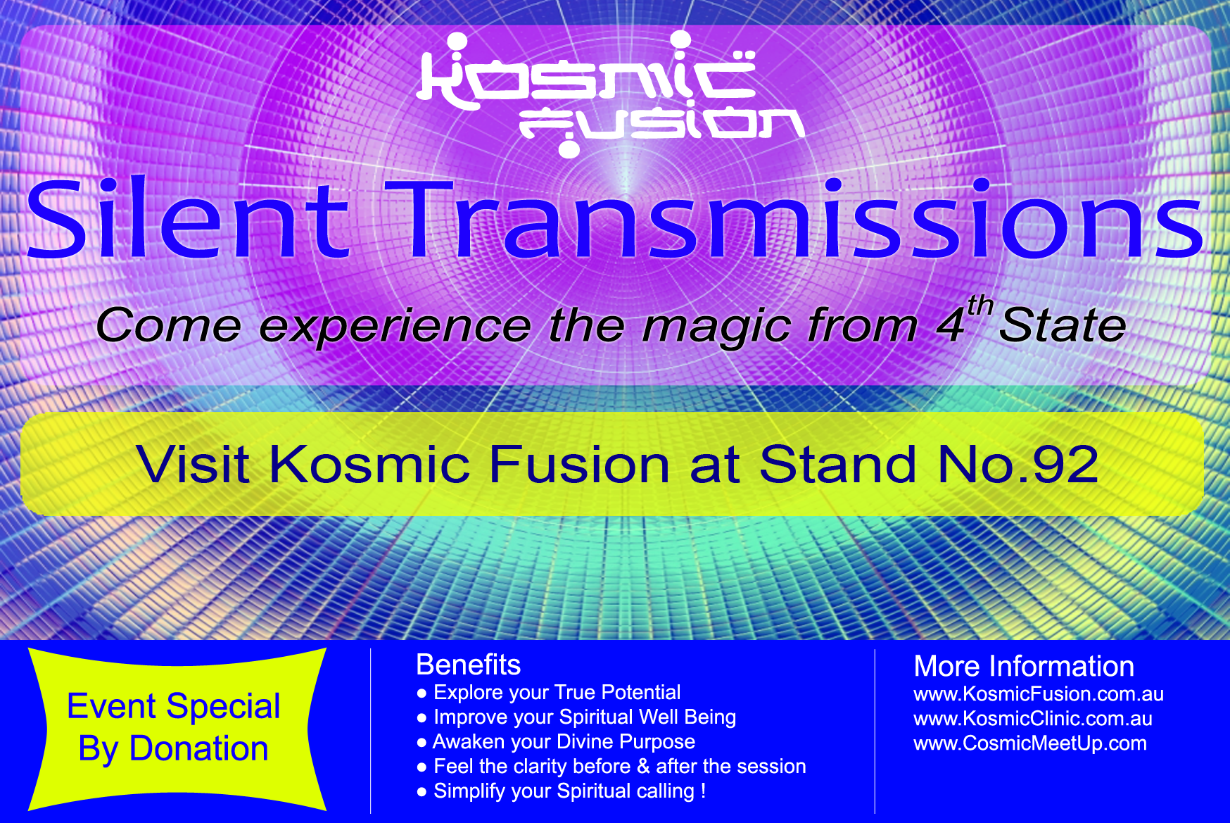 In the past two years Kosmic Fusion® presents the revolutionary themes in different exhibition events that never been experienced before – Feel the 3D/4D Dense Energy Body Grids, 22nd Century Multi-dimensional Holographic Healing, and other cutting-edge energy transmissions.